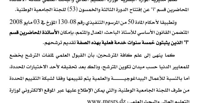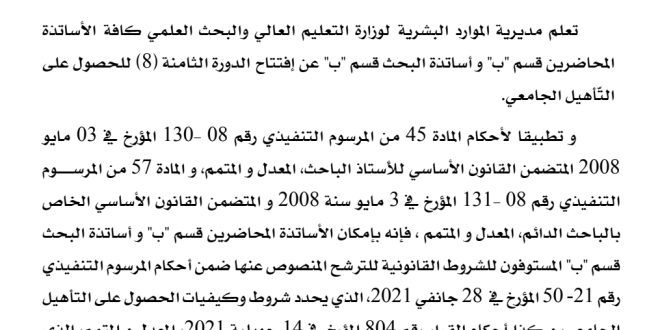 إعلان لفائدة الاساتذة المترشحين للحصول على التأهيل الجامعي لرتبة أستاذ محاضر (أ) – الدورة الثامنة 8 –