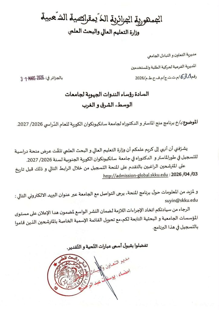 تنهي وزارة التعليم العالي والبحث العلمي إلى علم الطلبة الراغبين في مواصلة دراساتهم العليا بالخارج، أنها تلقت عرضاً للمنح الدراسية من جامعة “سانكيونكوان” (Sungkyunkwan University) بكوريا الجنوبية، وذلك للتسجيل في طوري الماستر والدكتوراة للسنة الجامعية 2026 / 2027.