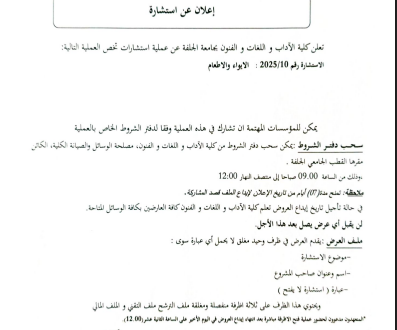 اعلان عن استشارة 6 ساعات مضت العمادة 0 تعلن كلية الآداب و اللغات و الفنون بجامعة الجلفة عن عملية استشارات تخص العملية التالية:الاستشارة رقم 2025/10 : الايواء والاطعام أكمل القراءة »