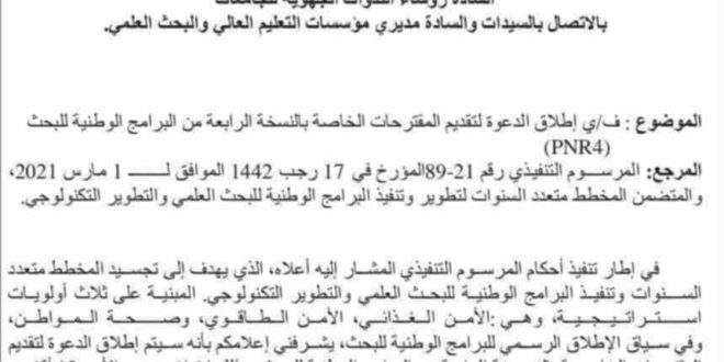 تقديم المقترحات الخاصة بالنسخة الرابعة من البرامج الوطنية للبحث 6 ساعات مضت العمادة 0 تقديم المقترحات الخاصة بالنسخة الرابعة من البرامج الوطنية للبحث PNR4 أكمل القراءة »