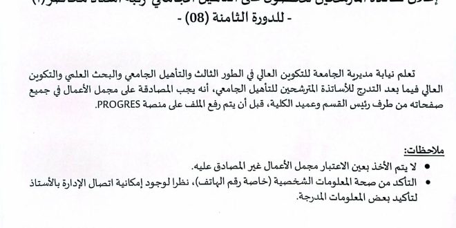إعلان لفائدة الاساتذة المترشحين للحصول على التأهيل الجامعي لرتبة أستاذ محاضر (أ) – الدورة الثامنة 8 – 3 ساعات مضت نيابة العمادة للبحث العلمي 0 إعلان لفائدة الاساتذة المترشحين للحصول على التأهيل الجامعي لرتبة أستاذ محاضر (أ) – الدورة الثامنة 8 – أكمل القراءة »