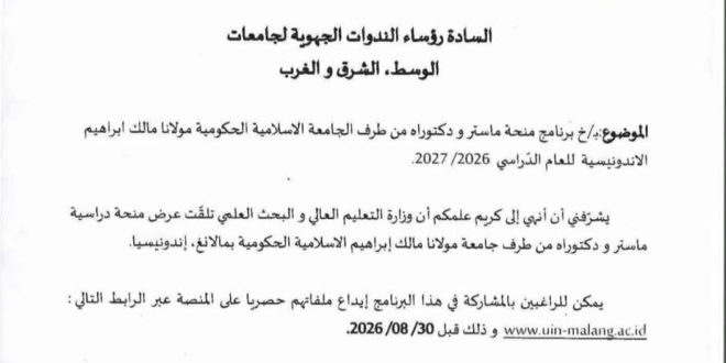 تعلن وزارة التعليم العالي والبحث العلمي (مديرية التعاون والتبادل الجامعي) عن تلقيها عرضاً لمنح دراسية لفائدة الطلبة الجزائريين من قبل الجامعة الإسلامية الحكومية “مولانا مالك إبراهيم” بمالانغ، إندونيسيا، وذلك بعنوان السنة الجامعية 2026-2027.تفاصيل العرض:المستهدفون: الطلبة الراغبون في التحضير لشهادات الماستر أو الدكتوراه.المؤسسة المانحة: جامعة مولانا مالك إبراهيم الإسلامية الحكومية – …