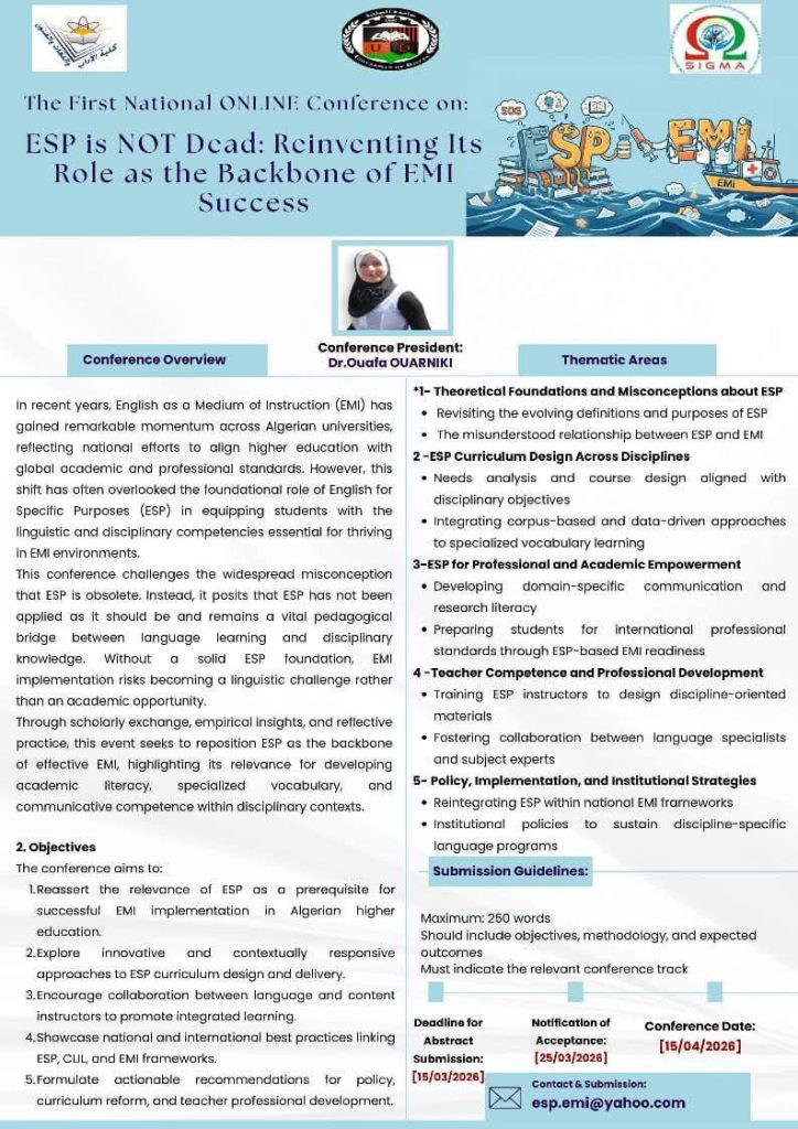 As Algerian universities transition toward English as a Medium of Instruction (EMI), we invite researchers and practitioners to explore how English for Specific Purposes (ESP) provides the essential foundation for academic and professional excellence.